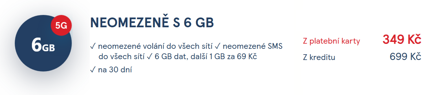 Balíček služeb k předplacené kartě Tesco Mobile Neomezeně s 6 GB dat je určen pro středně náročné zákazníky, kteří využijí především neomezené hovory v kombinaci se základním nevysokým objemem dat. Ještě méně zaplatí zákazníci za podobný balíček služeb se 2 GB dat, a to 299 Kč měsíčně namísto ceníkových 499 Kč. Trojici zlevněných tarifů doplňuje úplný základ Komplet za 149 Kč (ceník 299 Kč), který zahrnuje 100 volných hovorových jednotek a SMS se 2 GB dat. Rychlost dat není prakticky omezena (150/50 Mbit/s) a sleva je podle operátora trvalá na neomezenou dobu.