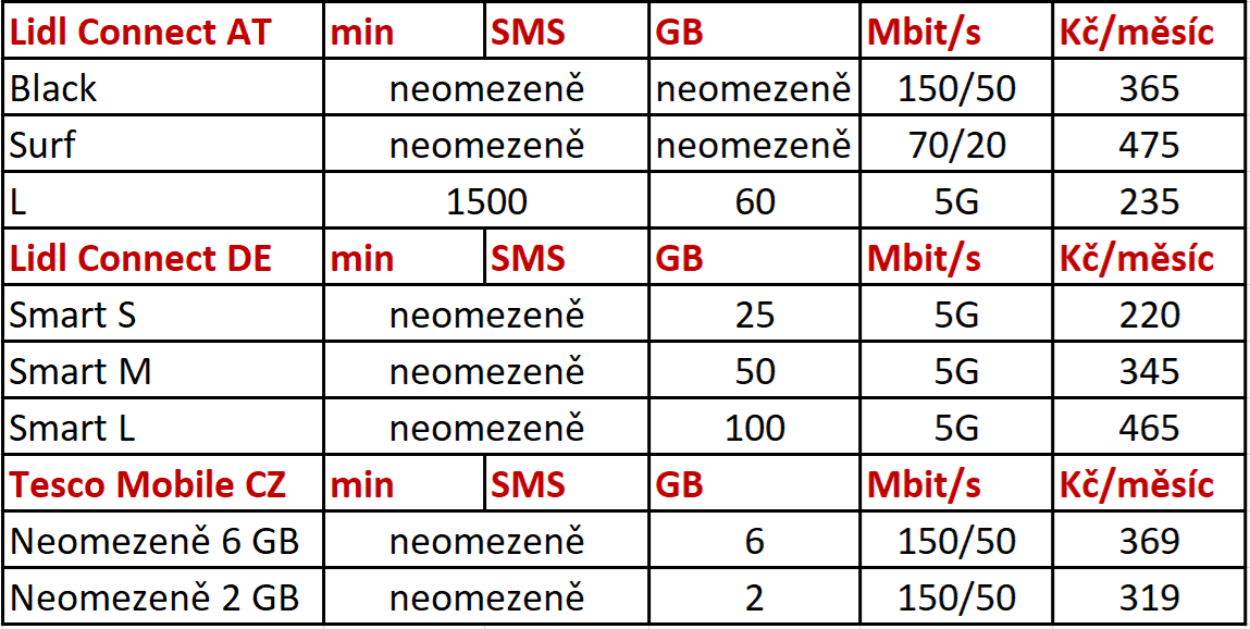 Pokud by Lidl opravdu přišel na český trh jako mobilní virtuální operátor, jak pravděpodobné je snížení vysokých cen? Porovnali jsme současné německé a rakouské ceny mobilních tarifů Lidl Connect s cenami českého virtuálního operátora. Zbylo jich jako šafránu, ale jistou představu si lze udělat z cen Lidl Connectu v Rakousku a Německu a v českém Tesco Mobile vlastněném z poloviny Tesco Stores a O2p Czech Republic. Tesco je maloobchodní řetězec podobný Lidlu a Tesco Mobile působí na trhu už dlouhodobě.