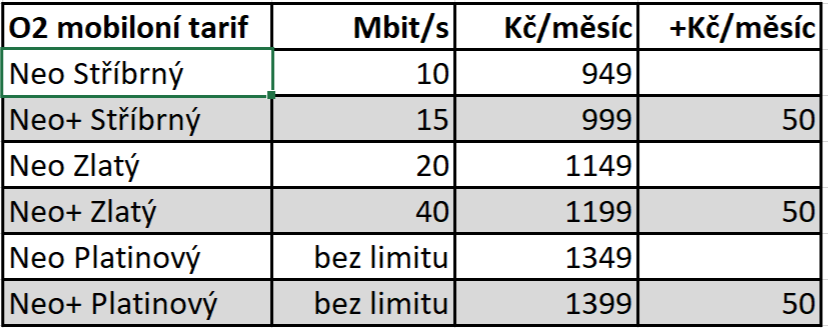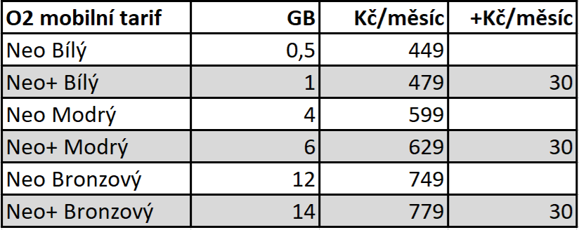 Všechny tarify v obou tabulkách zahrnují neomezené volání a SMS. Starší už neplatné měly v názvu Neo, nové tarify Neo k němu přidaly znaménko "+" a platí od včerejšího 2.2.2026. První tabulka shrnuje zdražení datově omezených tarifů o 30 Kč. O2 zdražení kompenzuje přidáním pár gigabytů dat.